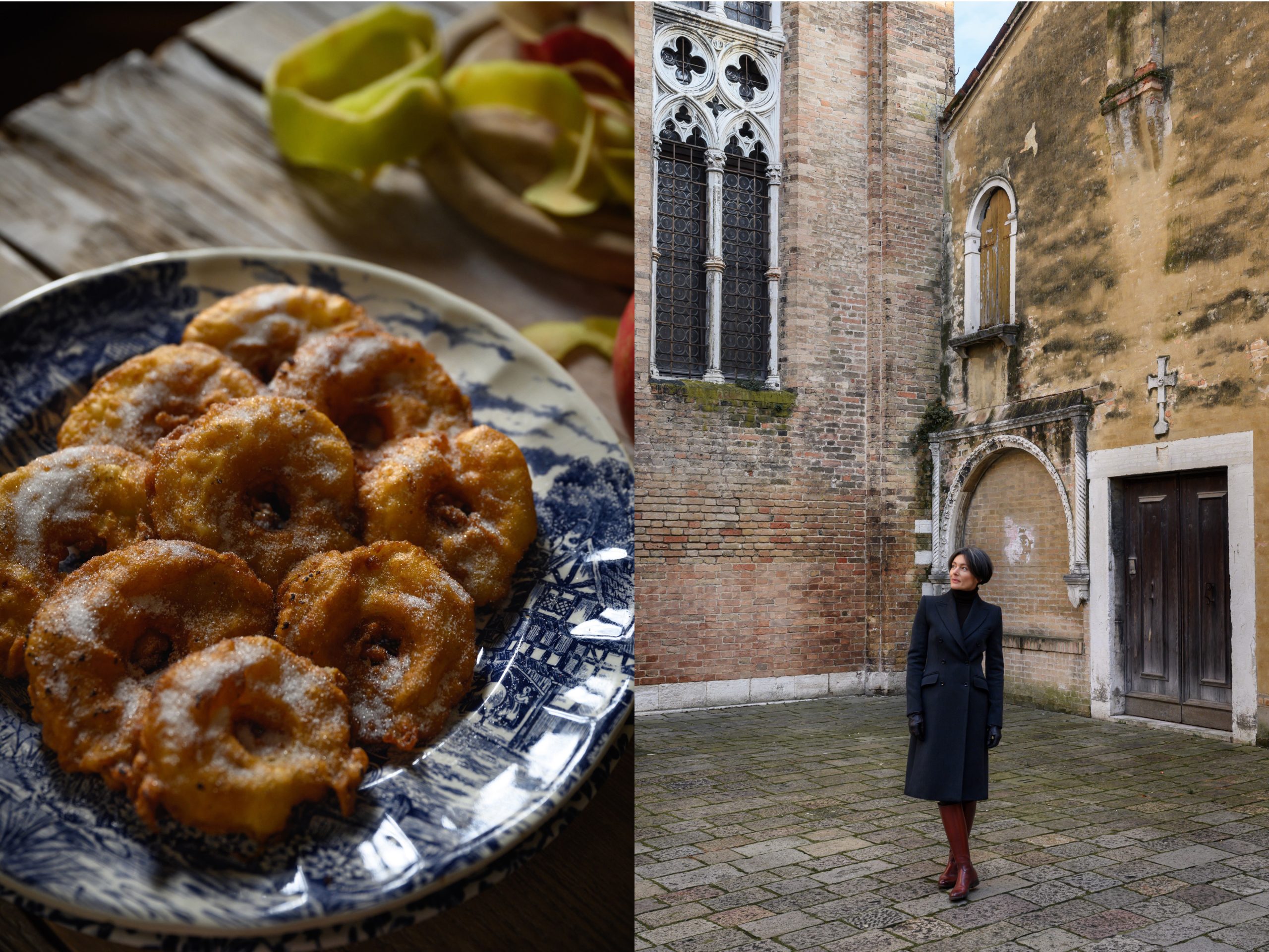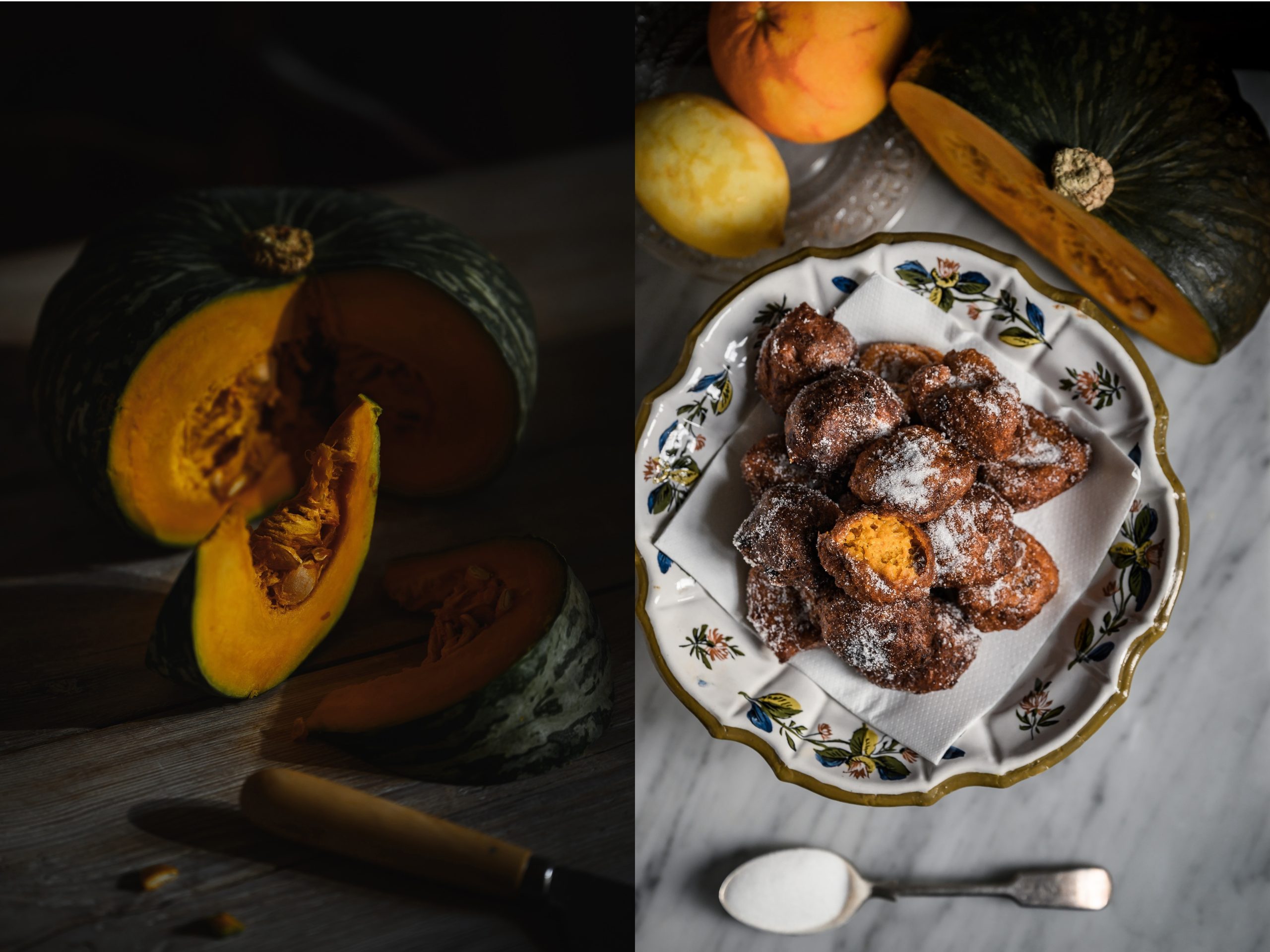 So here I am, practically at dawn in my new little Venetian kitchen, with the carnival period upon us and the friettelle season officially under way, I’m preheating my oven to 180 C whilst dividing the sweet Delica pumpkin flesh into evenly sized chunks to bake them until soft. Puree soft is really what I’m after.
